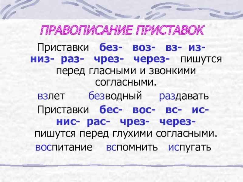 Приставки бес- вос- вс- ис- нис- рас- чрез- через- пишутся перед глухими согласными.