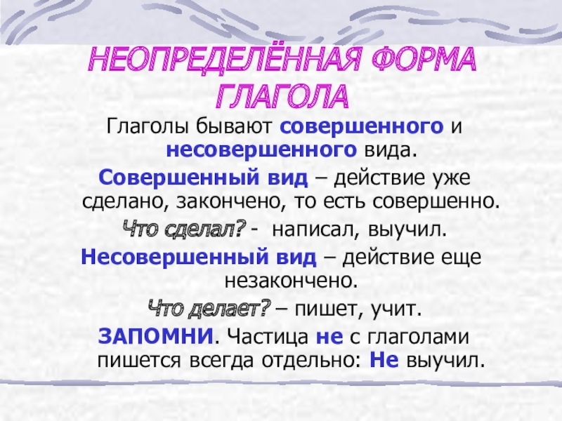 Слайд 20НЕОПРЕДЕЛЁННАЯ ФОРМА ГЛАГОЛА