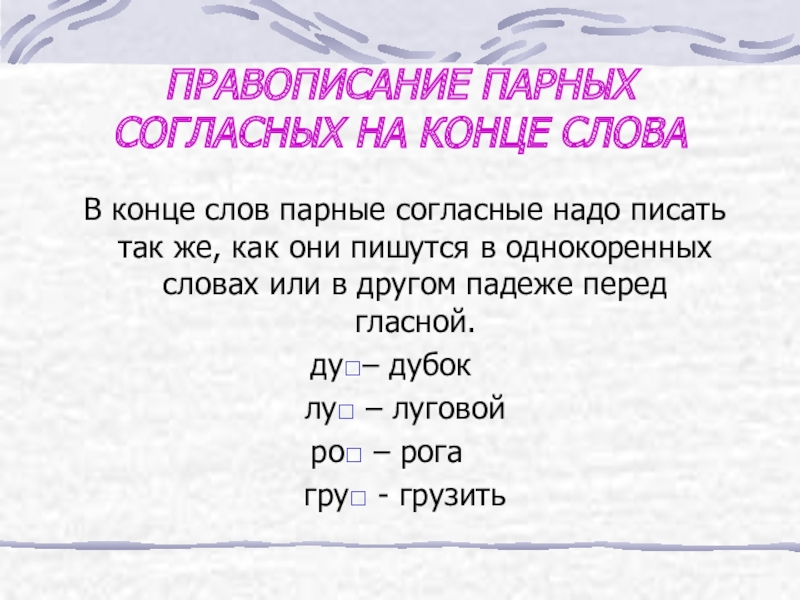 Слайд 6ПРАВОПИСАНИЕ ПАРНЫХ СОГЛАСНЫХ НА КОНЦЕ СЛОВА