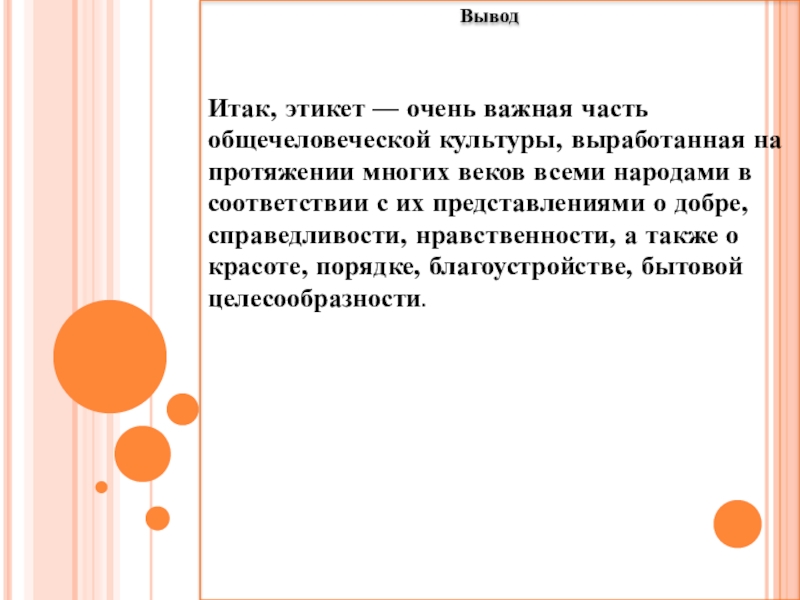 Итак, этикет — очень важная часть общечеловеческой культуры, выработанная на протяжении многих веков всеми народами в соответствии с их представлениями о добре, справедливости, нравственности, а также о красоте, порядке, благоустройстве, бытовой целесообразности.