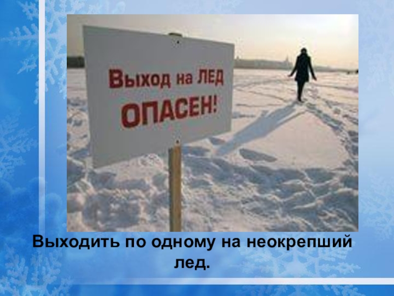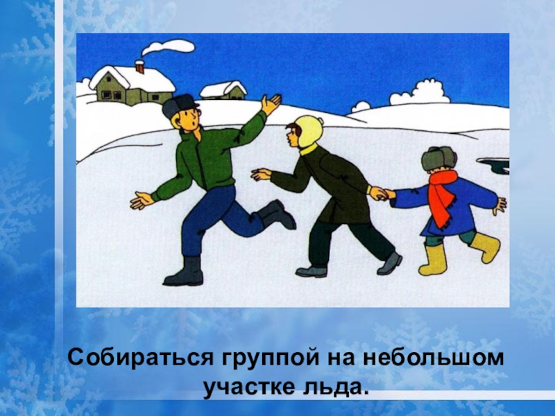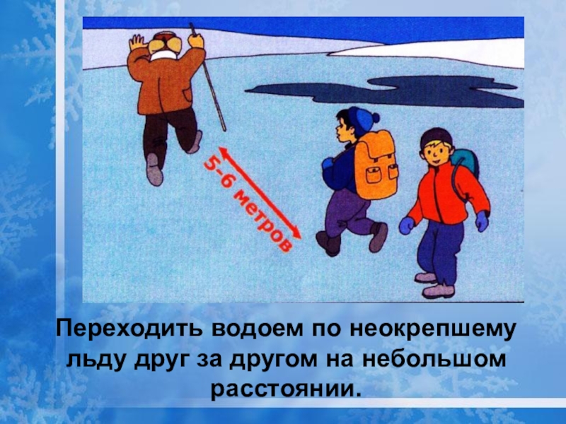 Слайд 12Переходить водоем по неокрепшему льду друг за другом на небольшом расстоянии.