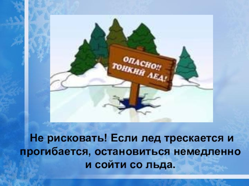 Слайд 16 Не рисковать! Если лед трескается и прогибается, остановиться немедленно и