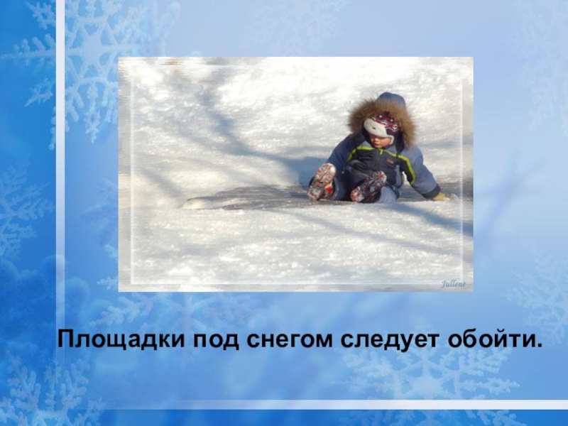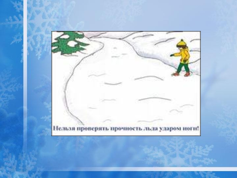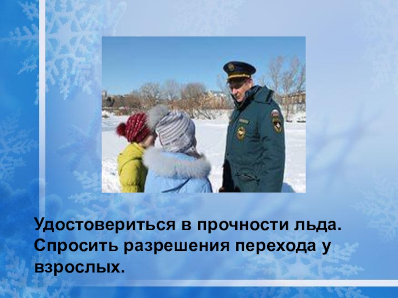 Слайд 17Удостовериться в прочности льда. Спросить разрешения перехода у взрослых.