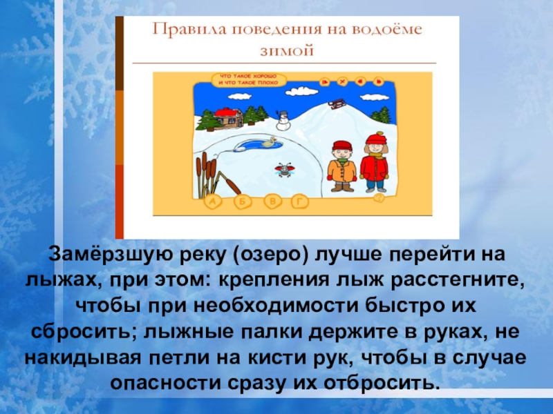 Слайд 21 Замёрзшую реку (озеро) лучше перейти на лыжах, при этом: крепления лыж