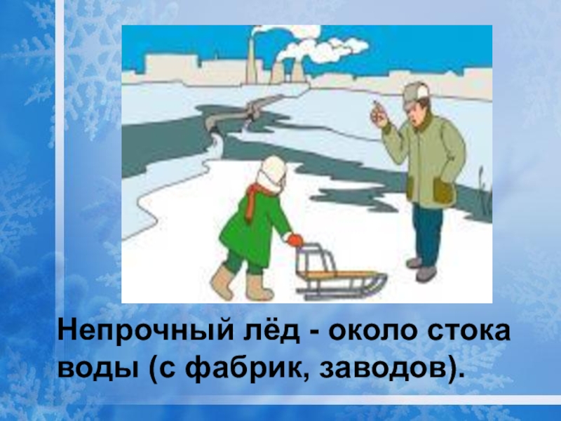 Слайд 2Непрочный лёд - около стока воды (с фабрик, заводов).