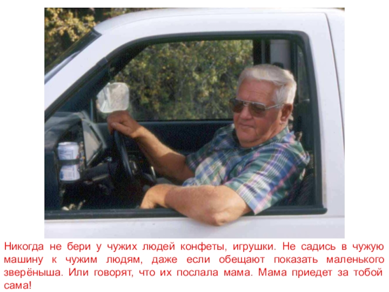 Слайд 41Никогда не бери у чужих людей конфеты, игрушки. Не садись в