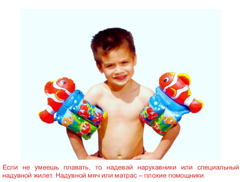 Слайд 21Если не умеешь плавать, то надевай нарукавники или специальный надувной жилет.