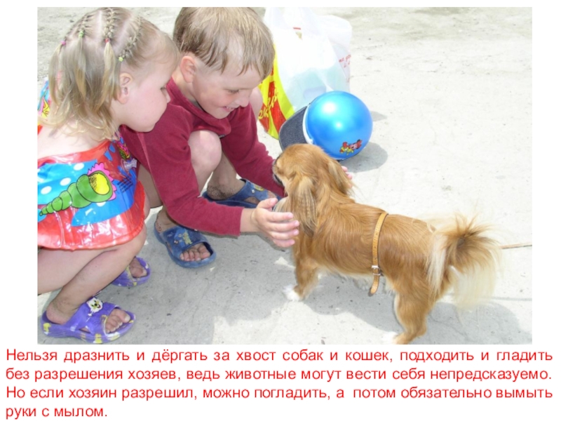 гладить без разрешения хозяев, ведь животные могут вести себя непредсказуемо. Но если хозяин разрешил, можно погладить, а потом обязательно вымыть руки с мылом.
