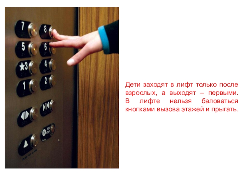 Слайд 9Дети заходят в лифт только после взрослых, а выходят – первыми.