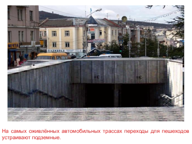 Слайд 35На самых оживлённых автомобильных трассах переходы для пешеходов устраивают подземные.