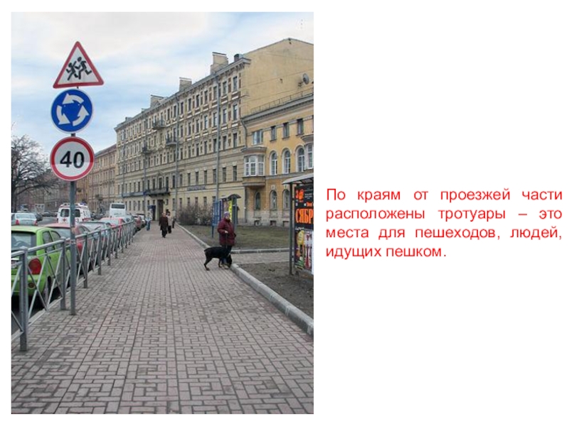 Слайд 30По краям от проезжей части расположены тротуары – это места для