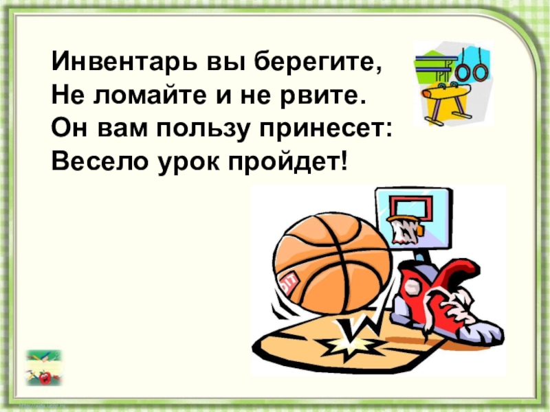 Инвентарь вы берегите,Не ломайте и не рвите.Он вам пользу принесет:Весело урок пройдет!