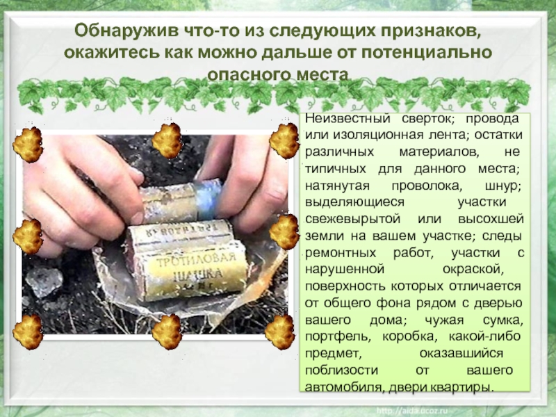 Неизвестный сверток; провода или изоляционная лента; остатки различных материалов, не типичных для данного места; натянутая проволока, шнур; выделяющиеся участки свежевырытой или высохшей земли на вашем участке; следы ремонтных работ, участки с нарушенной окраской, поверхность которых отличается от общего фона рядом с дверью вашего дома; чужая сумка, портфель, коробка, какой-либо предмет, оказавшийся поблизости от вашего автомобиля, двери квартиры.