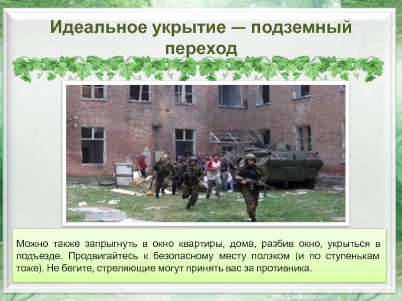 разбив окно, укрыться в подъезде. Продвигайтесь к безопасному месту ползком (и по ступенькам тоже). Не бегите, стреляющие могут принять вас за противника.