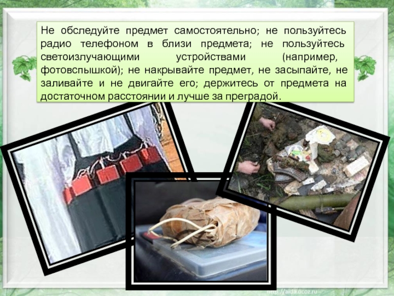 Слайд 12Не обследуйте предмет самостоятельно; не пользуйтесь радио телефоном в близи предмета;