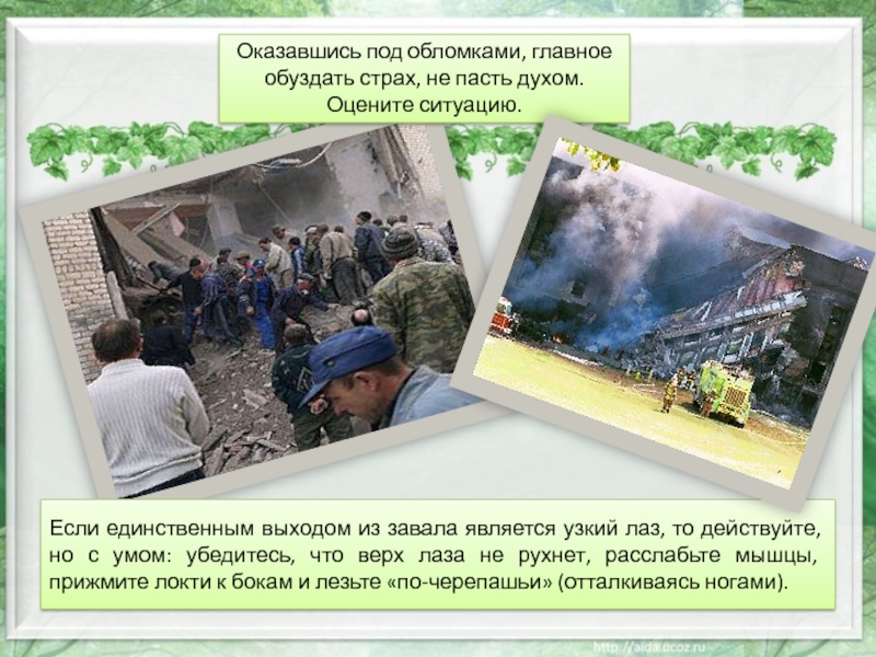 если под завалом ваши близкие люди), делают это специалисты с учетом возможных обрушений. В любой ситуации попытайтесь сохранить спокойствие и хладнокровие, ваша истерика и паника только усугубят ситуацию.