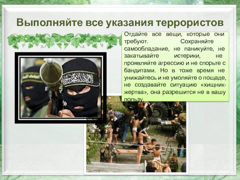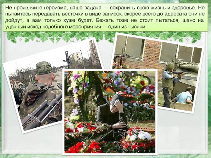 Слайд 23Не проявляйте героизма, ваша задача — сохранить свою жизнь и здоровье.