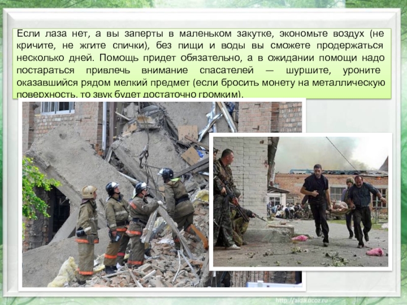 Слайд 17Если лаза нет, а вы заперты в маленьком закутке, экономьте воздух