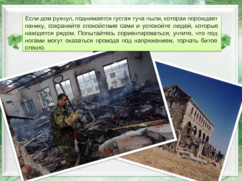 Слайд 15Если дом рухнул, поднимается густая туча пыли, которая порождает панику, сохраняйте