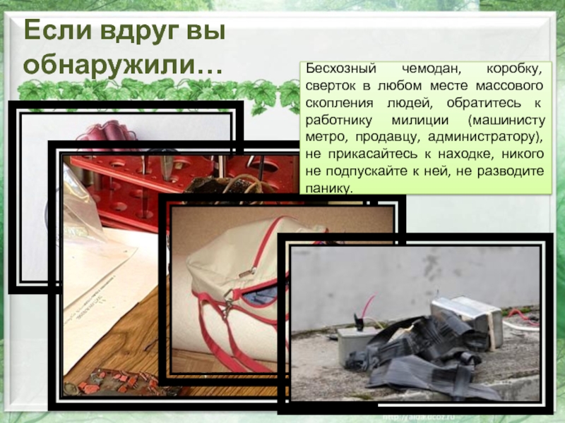 массового скопления людей, обратитесь к работнику милиции (машинисту метро, продавцу, администратору), не прикасайтесь к находке, никого не подпускайте к ней, не разводите панику.