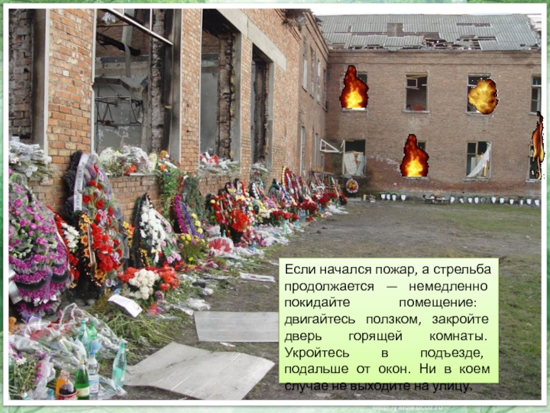 Слайд 6Если начался пожар, а стрельба продолжается — немедленно покидайте помещение: двигайтесь