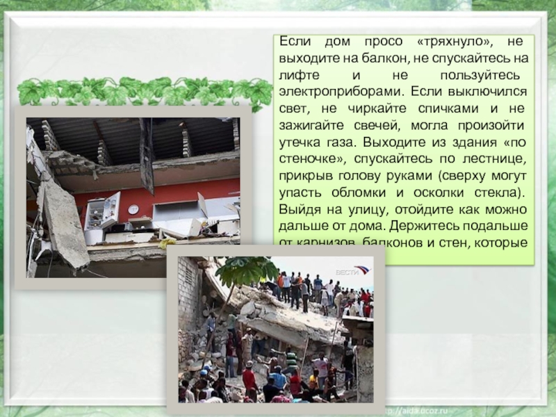 лифте и не пользуйтесь электроприборами. Если выключился свет, не чиркайте спичками и не зажигайте свечей, могла произойти утечка газа. Выходите из здания «по стеночке», спускайтесь по лестнице, прикрыв голову руками (сверху могут упасть обломки и осколки стекла). Выйдя на улицу, отойдите как можно дальше от дома. Держитесь подальше от карнизов, балконов и стен, которые могут рухнуть.