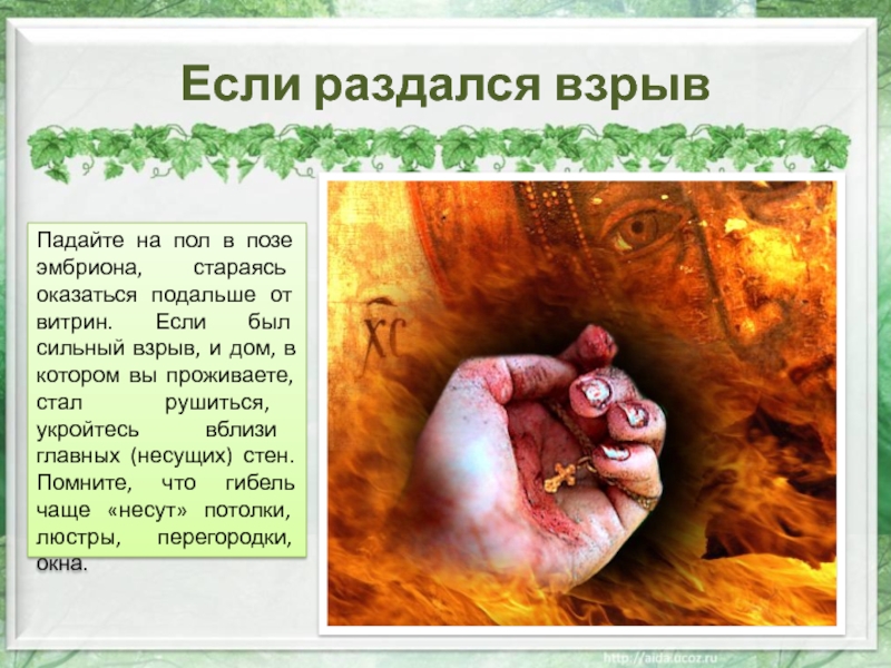от витрин. Если был сильный взрыв, и дом, в котором вы проживаете, стал рушиться, укройтесь вблизи главных (несущих) стен. Помните, что гибель чаще «несут» потолки, люстры, перегородки, окна.