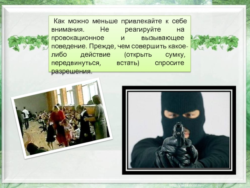Слайд 21 Как можно меньше привлекайте к себе внимания. Не реагируйте на