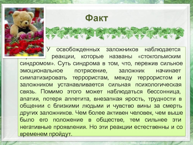 синдрома в том, что, пережив сильное эмоциональное потрясение, заложник начинает симпатизировать террористам, между террористом и заложником устанавливается сильная психологическая связь. Помимо этого может наблюдаться бессонница, апатия, потеря аппетита, внезапная ярость, трудности в общении с близкими людьми и чувство вины за смерть других заложников. Чем более активен человек, чем выше было его положение в обществе, тем сильнее эти негативные проявления. Но эти реакции естественны и со временем пройдут.