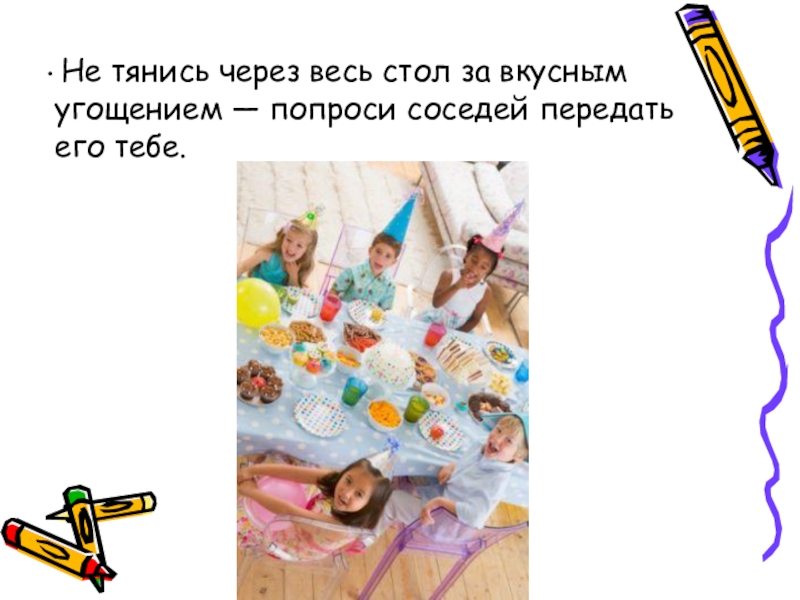 Слайд 5 Не тянись через весь стол за вкусным угощением — попроси