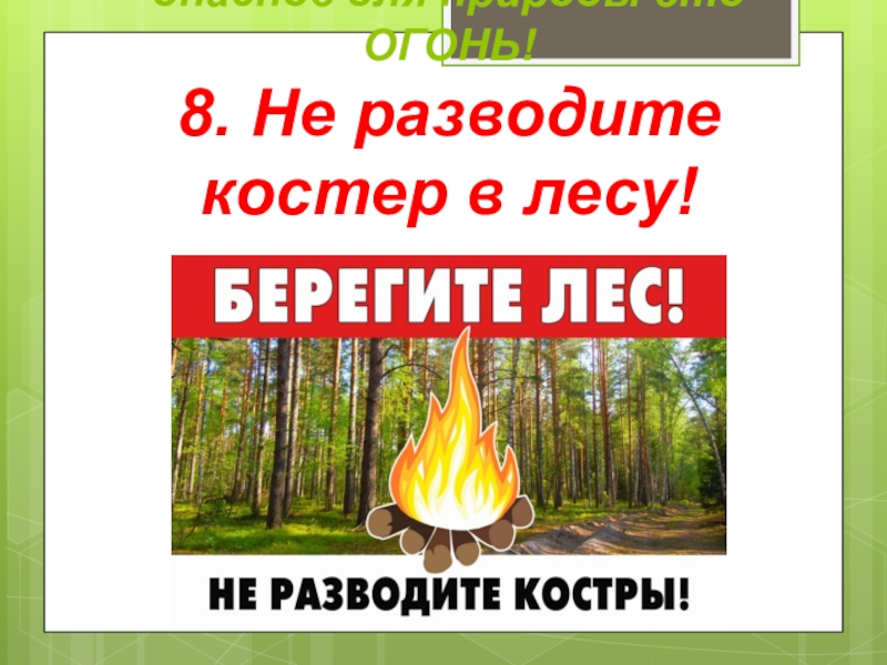 Слайд 9А самое главное и очень опасное для природы-это ОГОНЬ! 8. Не разводите