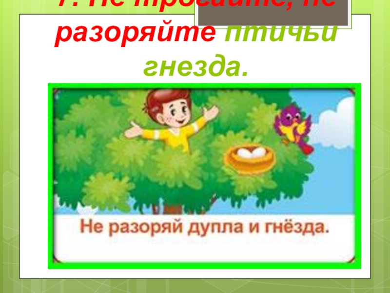 7. Не трогайте, не разоряйте птичьи гнезда.