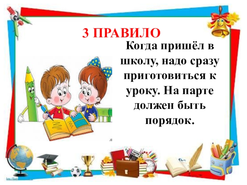 3 ПРАВИЛО Когда пришёл в школу, надо сразу приготовиться к уроку. На парте должен быть порядок.