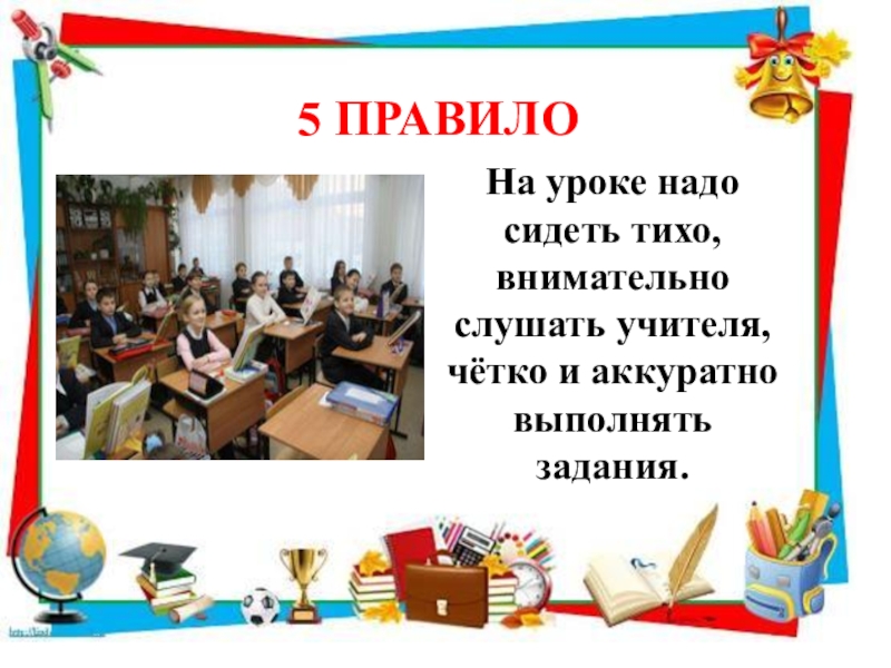 5 ПРАВИЛО На уроке надо сидеть тихо, внимательно слушать учителя, чётко и аккуратно выполнять задания.