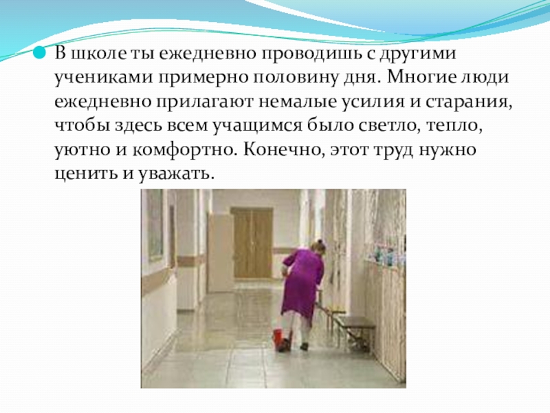 Многие люди ежедневно прилагают немалые усилия и старания, чтобы здесь всем учащимся было светло, тепло, уютно и комфортно. Конечно, этот труд нужно ценить и уважать.