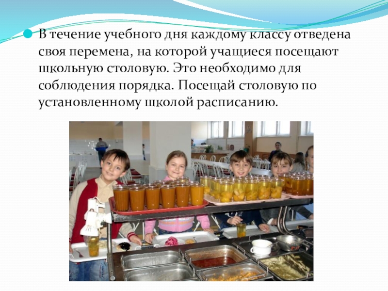 учащиеся посещают школьную столовую. Это необходимо для соблюдения порядка. Посещай столовую по установленному школой расписанию.