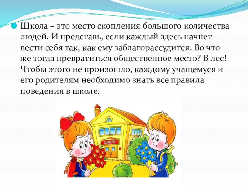 каждый здесь начнет вести себя так, как ему заблагорассудится. Во что же тогда превратиться общественное место? В лес! Чтобы этого не произошло, каждому учащемуся и его родителям необходимо знать все правила поведения в школе.