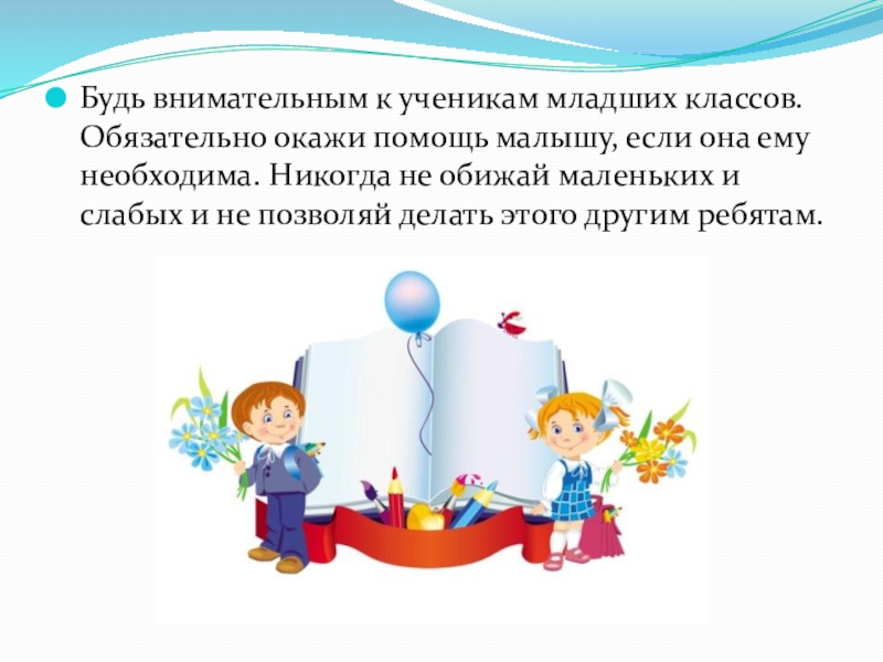 Слайд 28Будь внимательным к ученикам младших классов. Обязательно окажи помощь малышу, если