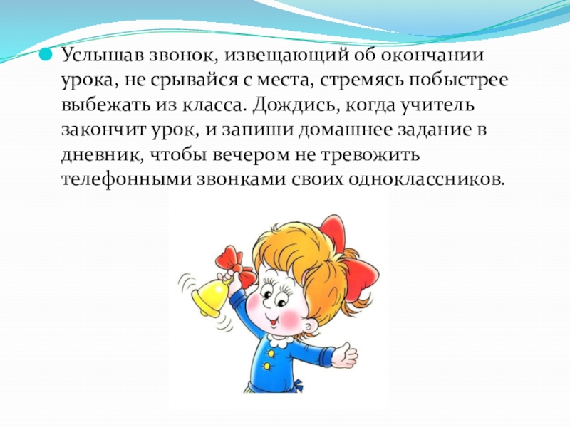 Слайд 21Услышав звонок, извещающий об окончании урока, не срывайся с места, стремясь