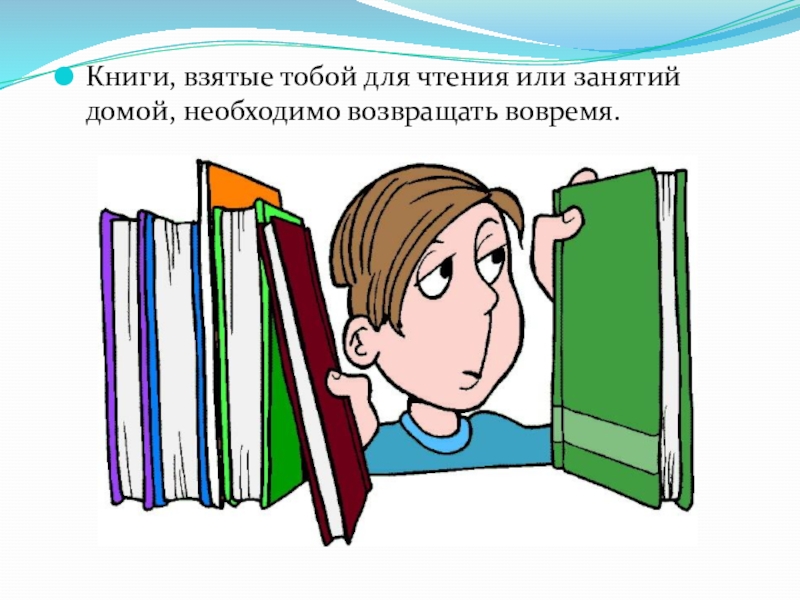 Слайд 43Книги, взятые тобой для чтения или занятий домой, необходимо возвращать вовремя.