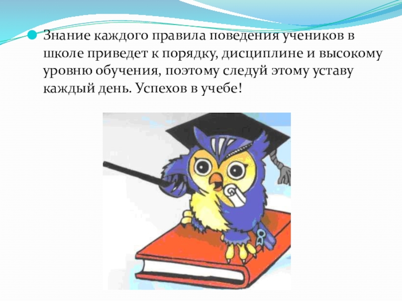 Слайд 48Знание каждого правила поведения учеников в школе приведет к порядку, дисциплине