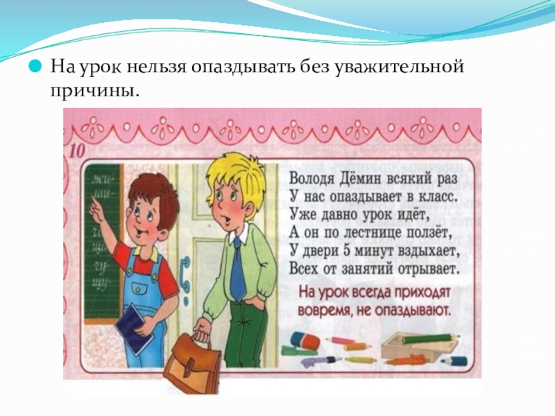 Слайд 13На урок нельзя опаздывать без уважительной причины.