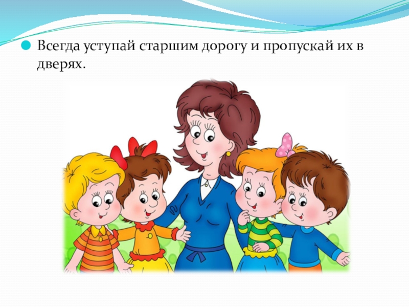 Слайд 27Всегда уступай старшим дорогу и пропускай их в дверях.