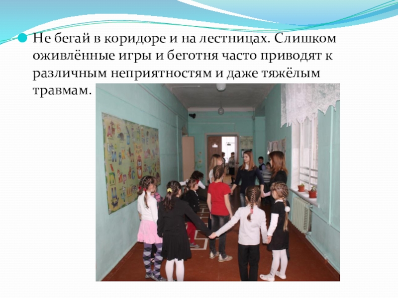 Слайд 25Не бегай в коридоре и на лестницах. Слишком оживлённые игры и