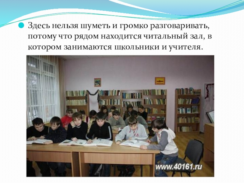 Слайд 42Здесь нельзя шуметь и громко разговаривать, потому что рядом находится читальный