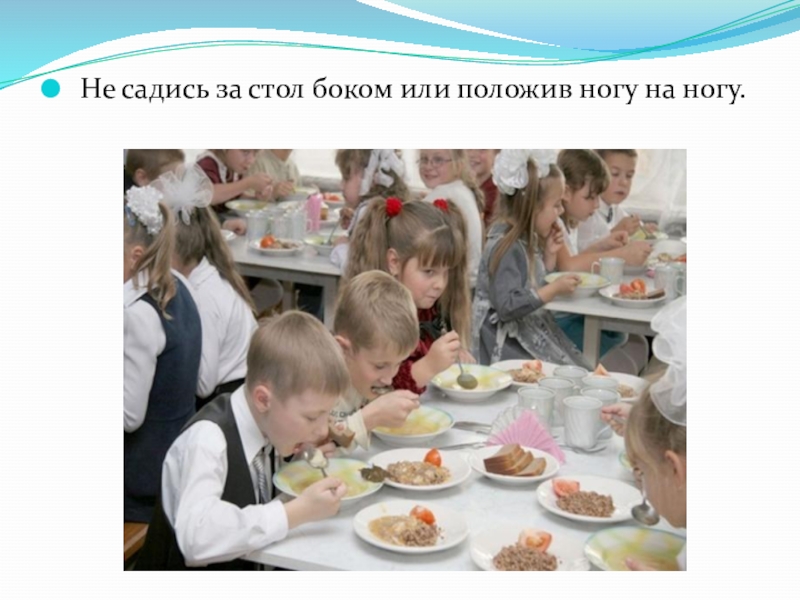 Слайд 37 Не садись за стол боком или положив ногу на ногу.