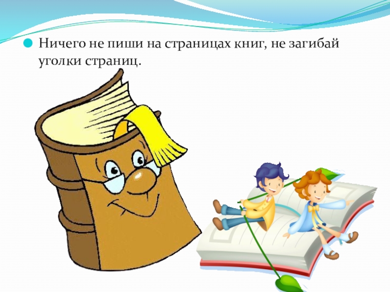 Слайд 44Ничего не пиши на страницах книг, не загибай уголки страниц.