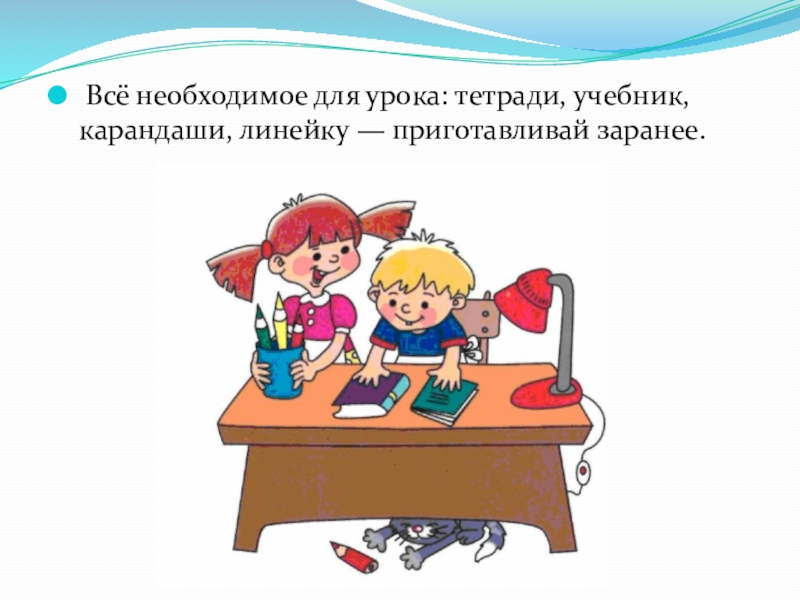 Слайд 14 Всё необходимое для урока: тетради, учебник, карандаши, линейку — приготавливай заранее.