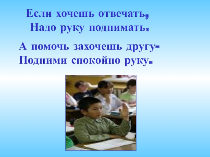7. Если учитель задаёт вопрос классу, и ты хочешь ответить, не выкрикивай , а ПОДНИМИ РУКУ. Руку надо поднимать и тогда , когда хочешь что-то спросить что-либо у учителя