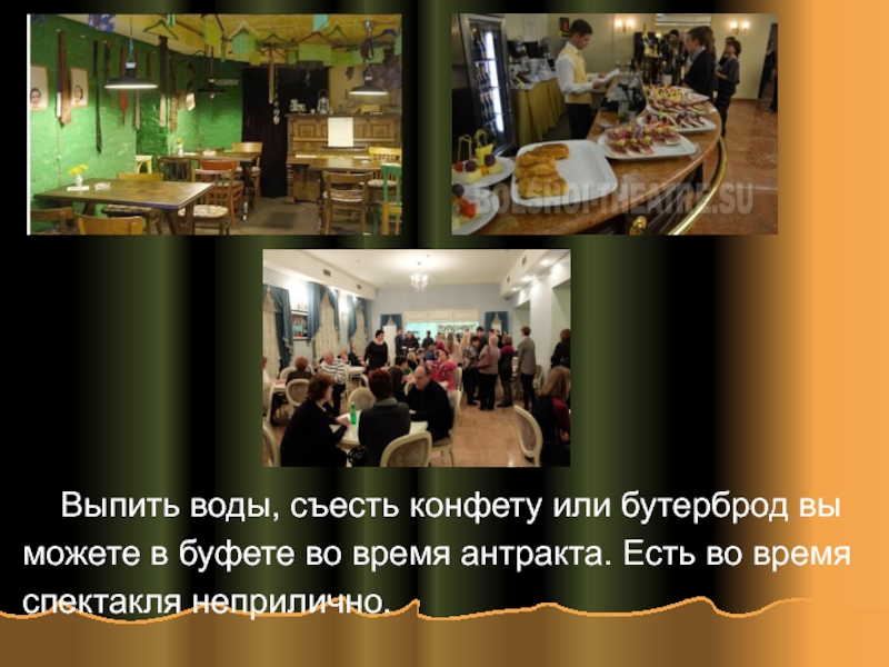 Выпить воды, съесть конфету или бутерброд выможете в буфете во время антракта. Есть во времяспектакля